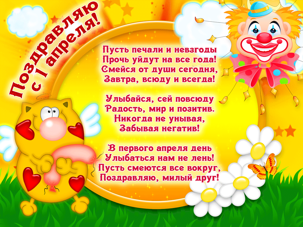 Пусть на Первое апреля Счастье, радость и успех, В мир чудес откроют двери, Где царит веселый смех! Пусть прибавит смех здоровья И взбодрит на целый год, Чтобы жить легко, вольготно, Без печали, бед, невзгод!