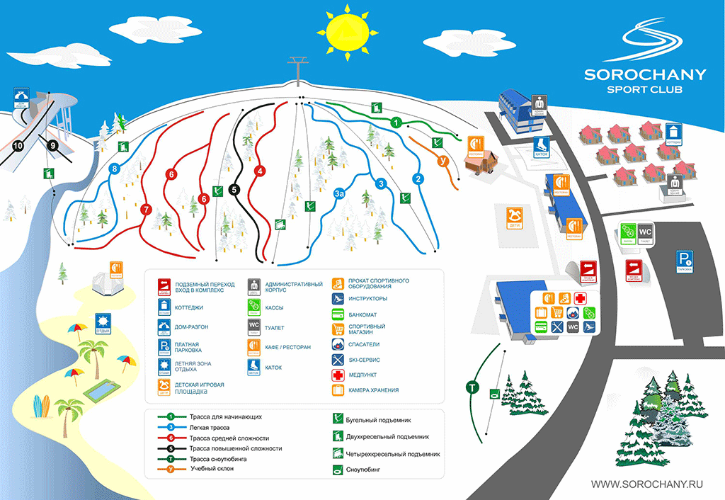 Если с вами приехали те, кто катаются хорошо, то к их радости в «Сорочанах» есть четыре «красных» спуска и один «чёрный». Так что, пока вы учитесь, они могут или оттачивать мастерство вместе с вами на пологих трассах, или спускаться по сложным участкам.