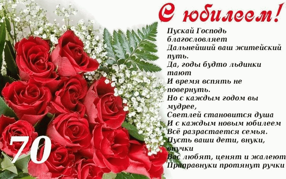 Сегодня день особенный у вас, Вам — 70, но их скрывать не надо. Пусть эти годы вас не устрашат, Они богатство ваше и награда. Поздравляем с юбилеем 70!