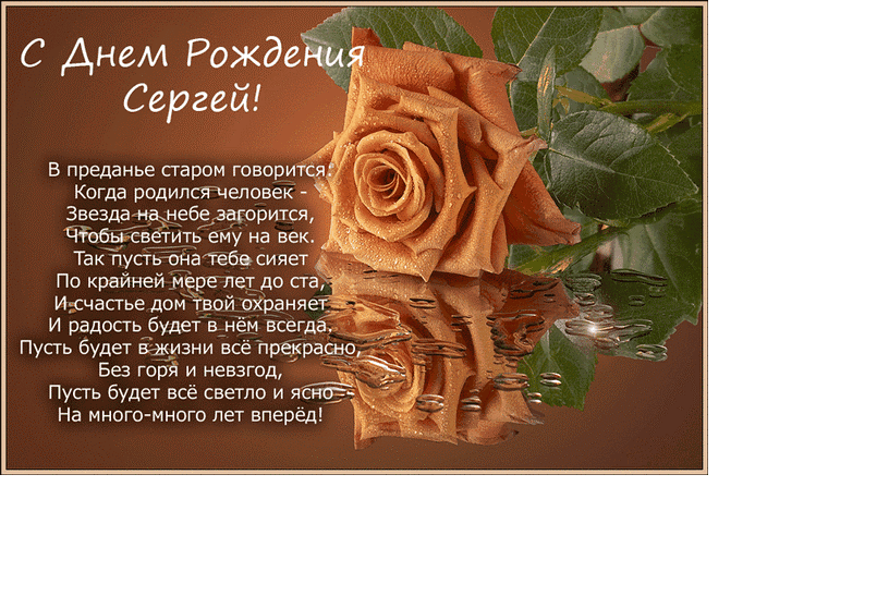 С днем рождения, Сергей. Пусть в жизни всё у тебя прекрасно будет. Без горя и бед чтобы каждый день с позитива начинался. Пусть счастье и любовь без устали охраняют дом, а гармония, чтобы царила с любовью и пониманием к близким. Пусть радуют и не огорчают дети, жена всегда пусть тобой гордится. Чтобы дом всегда был наполнен радостью и приятными заботами. Желаем самых сладких и интригующих ожиданий, чтобы реализованные планы всегда были оправданы временем. Результаты везде и во всем пусть радуют, и карьера не стоит на одном месте. Всегда в движении и вперед стремись достигать любые вершины, высоко всегда взбирайся и достойным победителем всегда будь. Высоко взлетай и никогда не падай, большой удачи в любых начинаниях и успешных завершений дел. Пусть будет как можно больше поводов для веселых и громких праздников в твоей жизни.